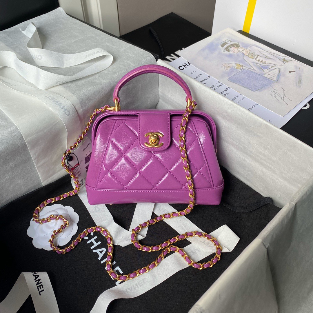 Ch*el MINI BAG WITH TOP HANDLE Shiny Lambskin & Gold-Tone Metal 12 × 18 × 7 cm